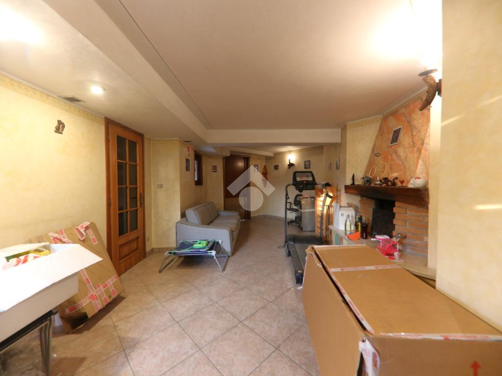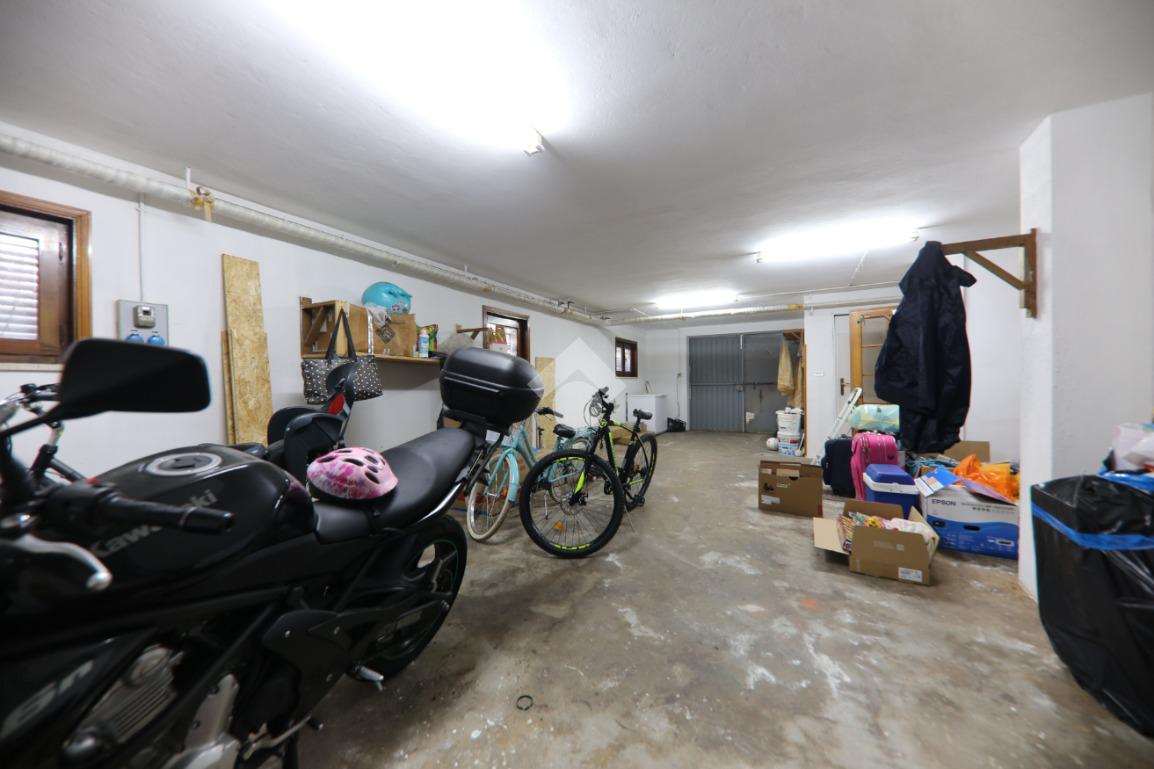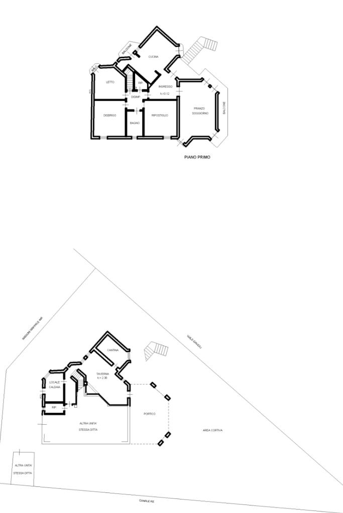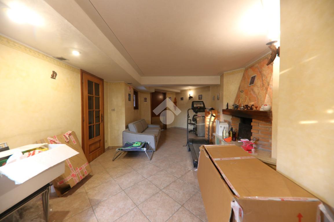 L'immobile, partendo da l piano rialzato, si compone di ingresso triangolare, grande soggiorno ottagonale con finestre sugli spigoli e balcone, grande cucina abitabile con secondo balcone, corridoio, tre camere matrimoniali, bagno e rispotiglio mentre al piano terra è presente una taverna con camino, cantina per i vini, lavanderia, disimpegno e profondo garage doppio. Completano la proprietà il grande giardino con rustico esterno.